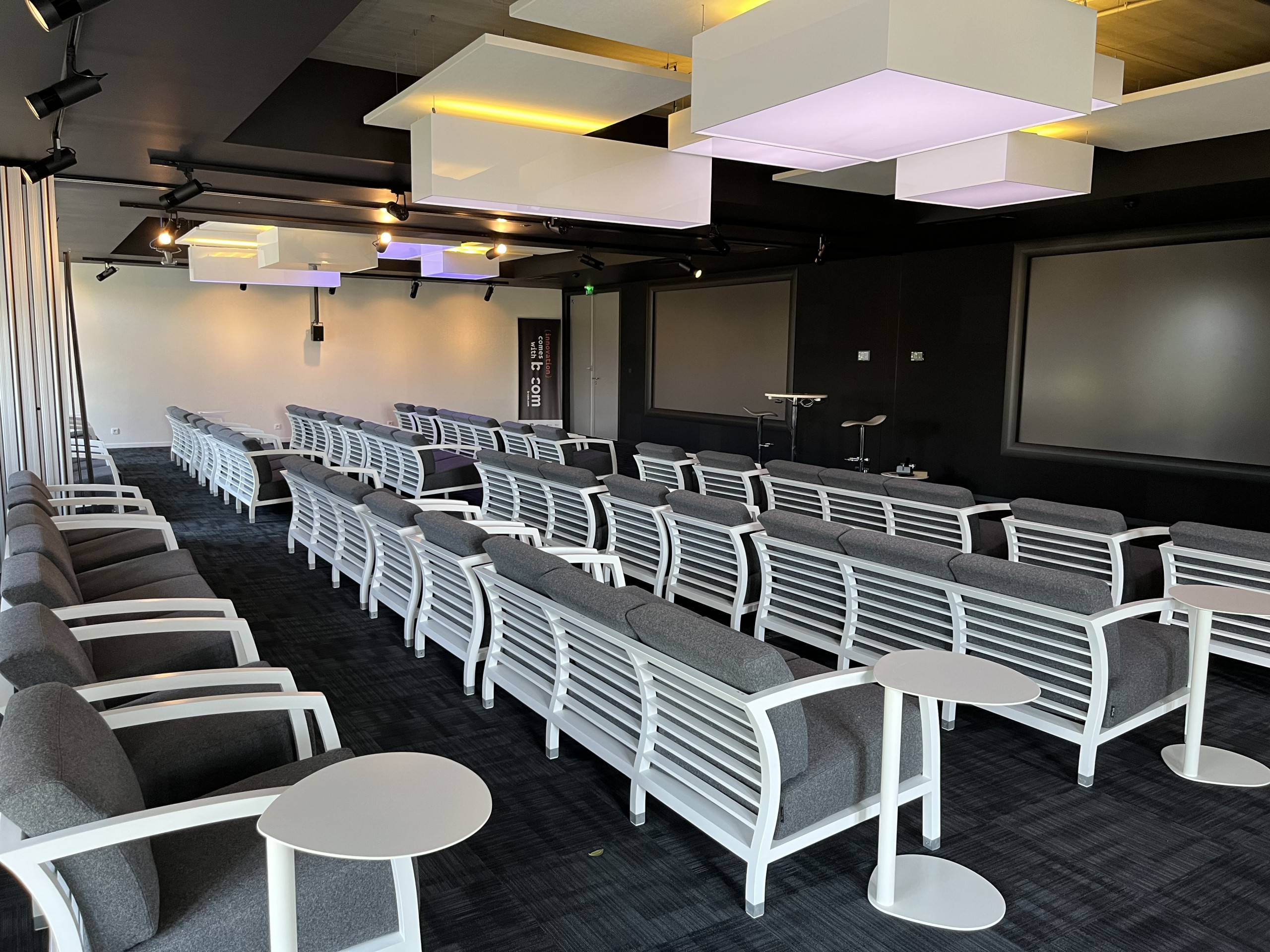 *l’Espace Hypermédia* vous propose des salles de réunions avec un dispositif premium et inédit pour s’immerger dans l’image et le son. Pour captiver votre auditoire : 2 murs d’écrans géants, un son optimal, des canapés et des fauteuils cosy. Cette surface modulable de 60m², aménageable en 1 ou 2 salles de réunion, permet d’accueillir de 5 à 60 personnes. Idéal pour vos présentations clients, séminaires d’équipe, réunions, soirées événementielles et dévoilements produits !